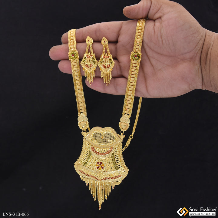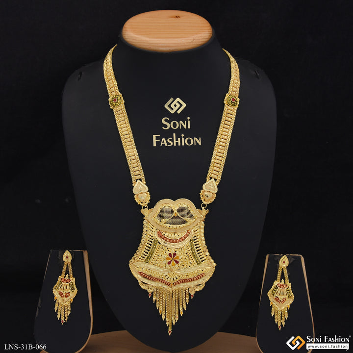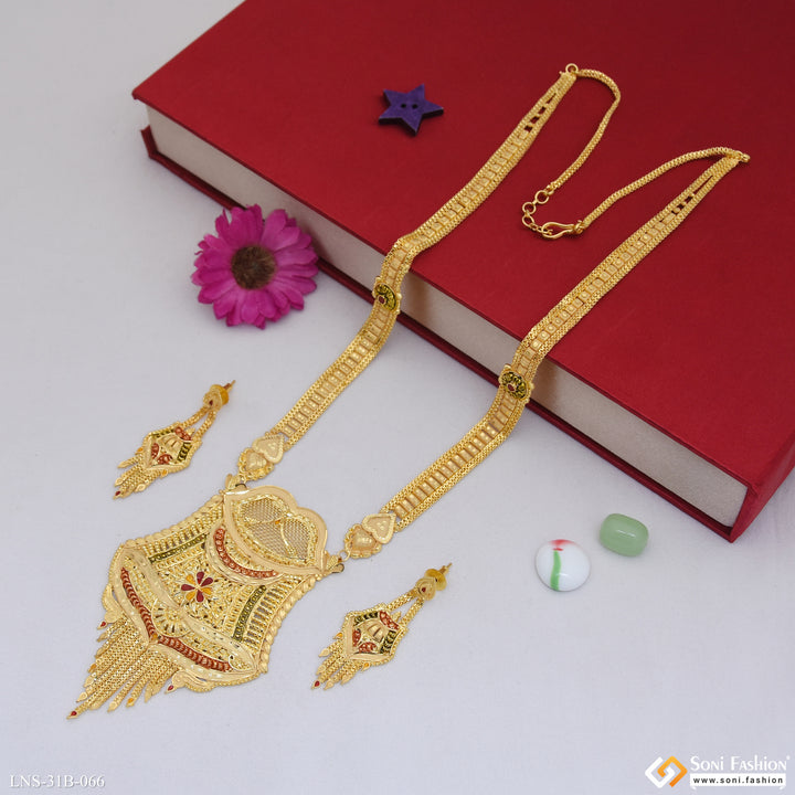 Add some elegance and royalty to your outfit with our Lovely Design Gold Plated Necklace Set for Women. Made with high-quality brass, this necklace set features a stunning filigree design and...