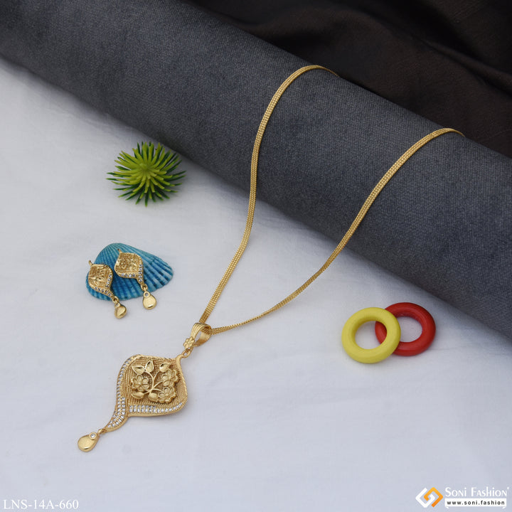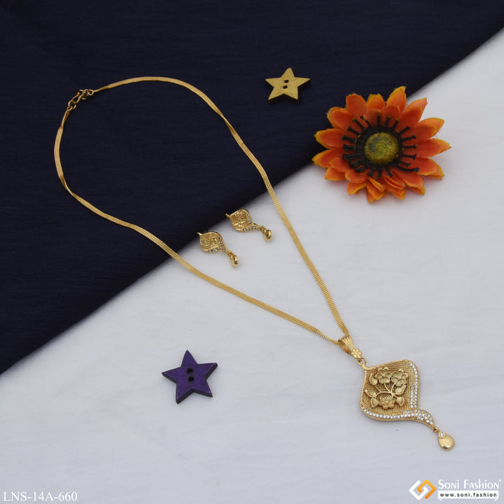 This lovely necklace set boasts a unique textured design and shining diamond detailing, adding a touch of royalty to any outfit. Its golden brass construction and hidden regal plating make it a trendy and hip addition to your jewelry collection. Stay ahead of the latest trends with this stylish piece.