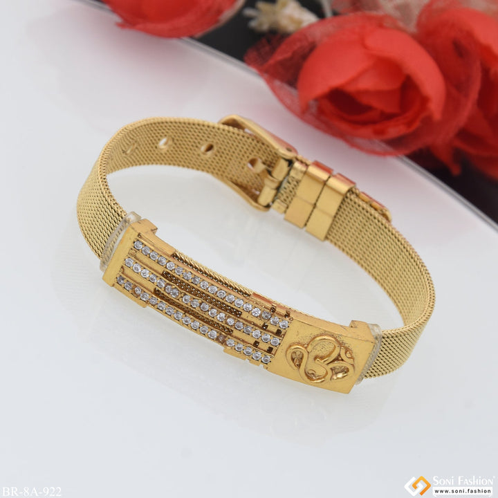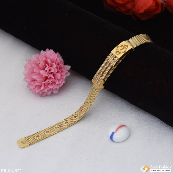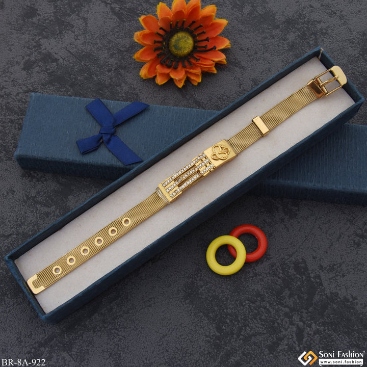 Experience the sophisticated style of religious-inspired fashion with this Om In Line Design With Diamond Gold Plated Stainless Steel Bracelet For Men. The golden bracelet is plated with HID Reg and...