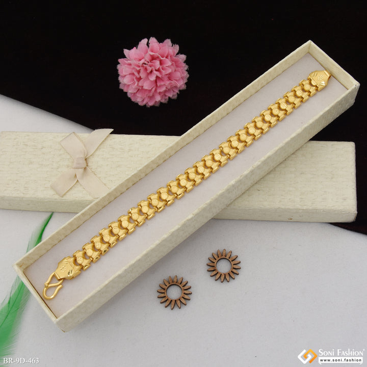 Expertly crafted for men, this Popular Design Gold Plated Bahubali Bracelet is a shining statement piece. With its unique Matt and Hollow design, this bracelet features Hid_Reg_Plating and is made of durable Brass. The intricate Filigree Design adds a touch of elegance to this Golden Bracelet. Step up your style with the Bracelet-Regular.