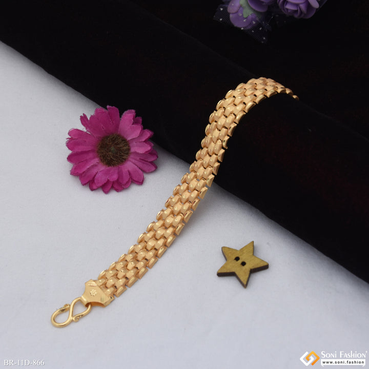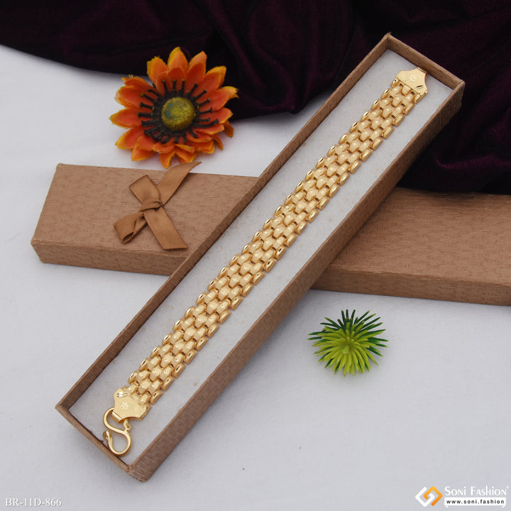 This Popular Design Gold Plated Bahubali Bracelet for Men combines a bold, matt finish with a hollow structure for comfortable wear. Crafted from durable brass and finished with high-quality golden plating,...