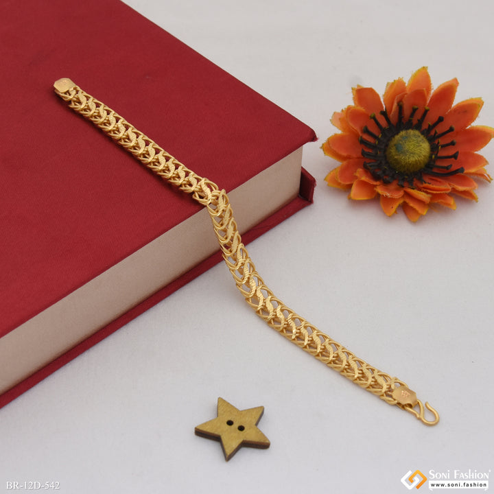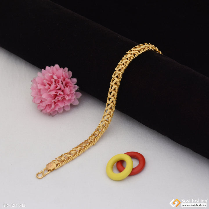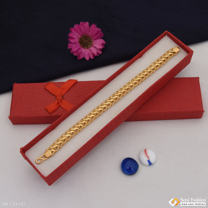 Introducing our popular design gold plated bracelet for men. This shining and royal piece features hid_reg_plating for added durability, a filigree design for a touch of elegance, and is made with high-quality brass. Elevate your style with this golden bracelet, perfect for any occasion.