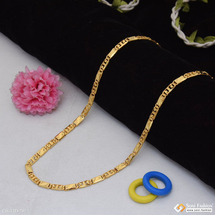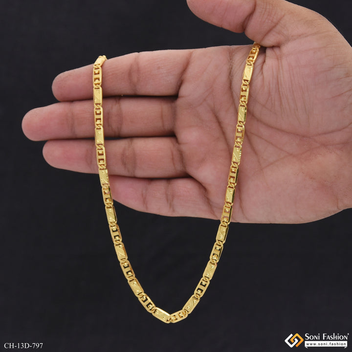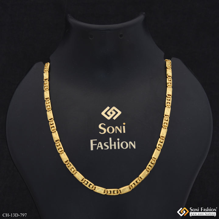 Elevate your style with our Popular Design Gold Plated Nawabi Chain for Men. Crafted with precision from brass, this 20-inch chain boasts a shining, royal appeal. The intricate filigree design and golden hue will make you stand out in any crowd. With Hid_Reg_Plating, this chain will maintain its impeccable quality for years to come.