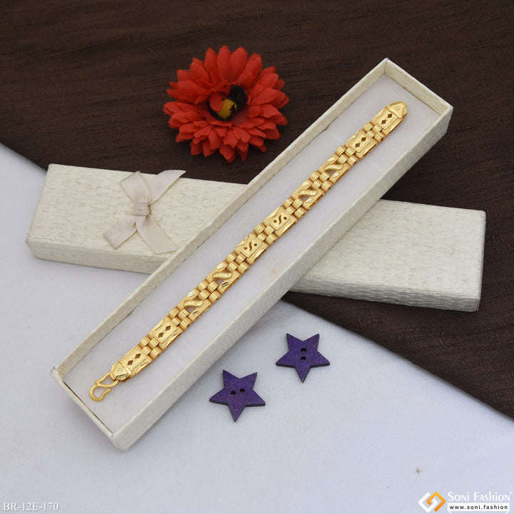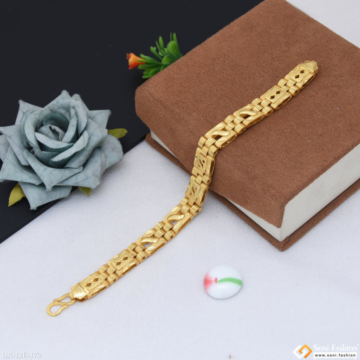 This stylish bracelet for men features a golden hue with a matte finish and intricate filigree design. Made with high-quality brass and a regular box bracelet design, it adds a touch of sophistication to any outfit. Crafted with prominent, hidden reg-plating, it offers long-lasting shine and durability.