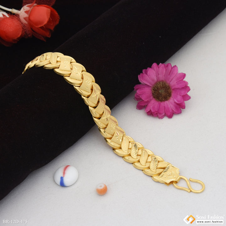 Introducing Prominent Design's gold plated Pokal bracelet for men. The shining, matt finish and intricate filigree design add a touch of royalty to this brass bracelet. Hollow and hid_reg_plating make it lightweight and comfortable to wear. A must-have for those who appreciate traditional Rajwadi style.
