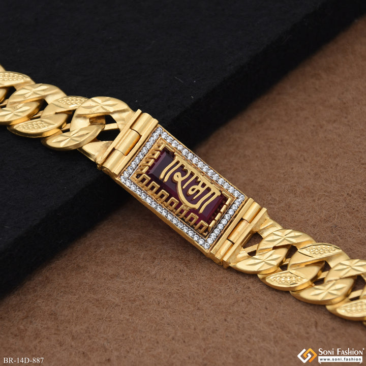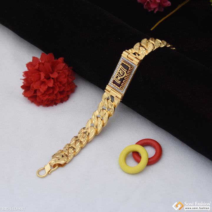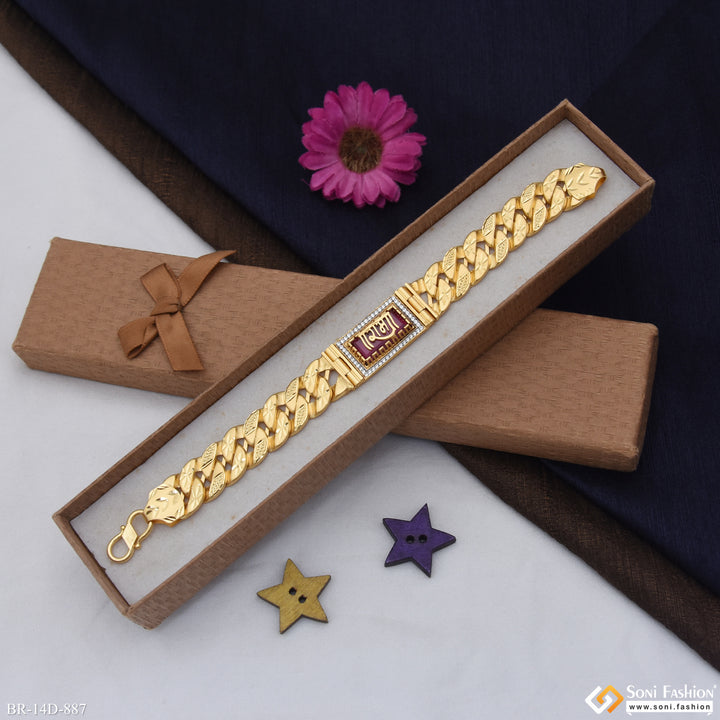 This Ram Awesome Design Gold Plated Pokal Bracelet for Men combines traditional symbolism with elegant craftsmanship. Featuring a striking red stone and a shining gold-plated finish, this hollow brass bracelet adds a religious touch with its Ram motif while maintaining a lightweight feel. Its diamond-like accents enhance its visual appeal, making it an ideal accessory for daily wear or special occasions.