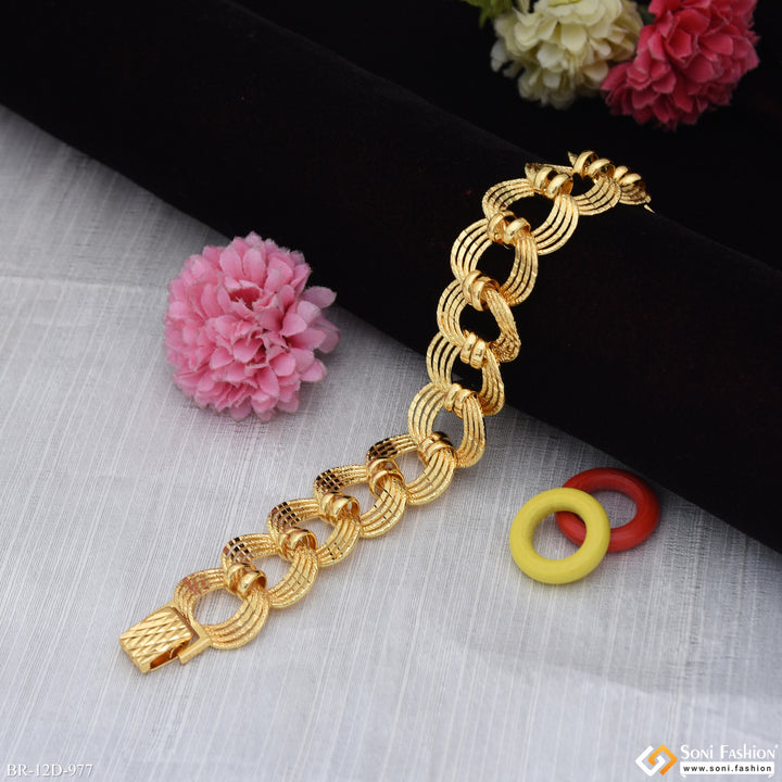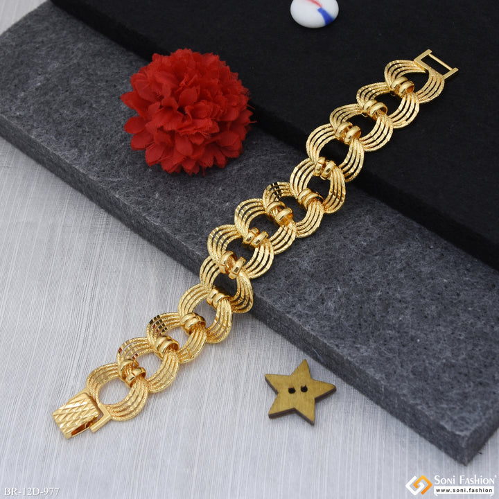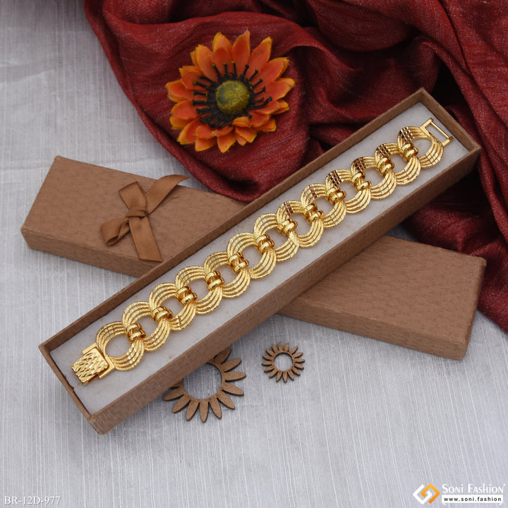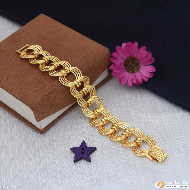 Elevate your style with the Ring Into Ring Gold Plated Link Bracelet for Men. Crafted from durable brass with high-quality gold plating, this bracelet features an intricate filigree design that adds a refined touch. Its regular size ensures a comfortable fit, making it perfect for everyday wear or special occasions. A shining accessory that complements any outfit with subtle elegance.