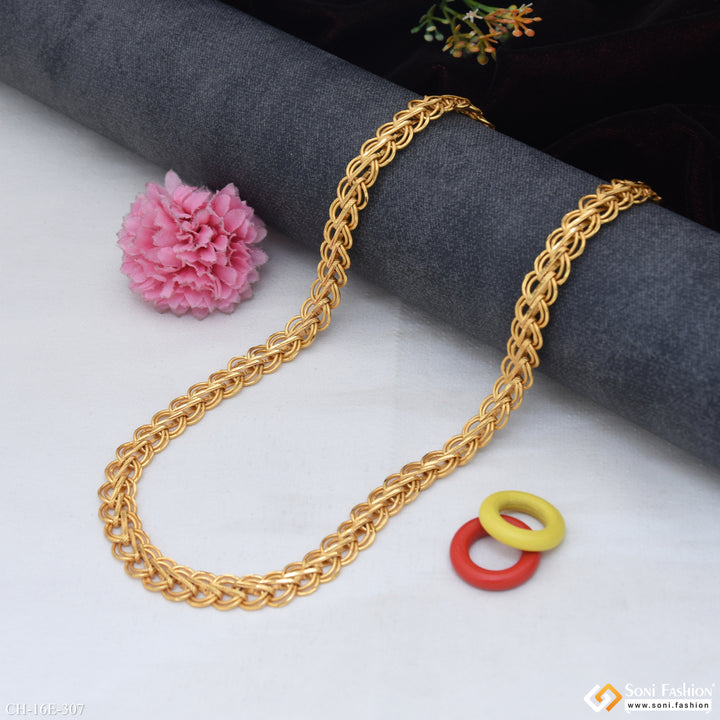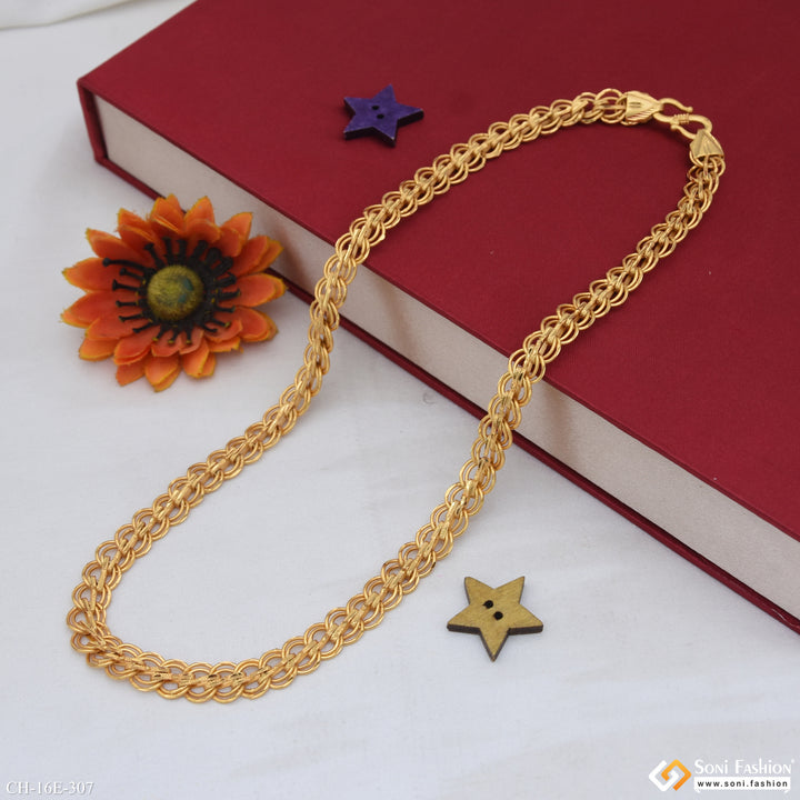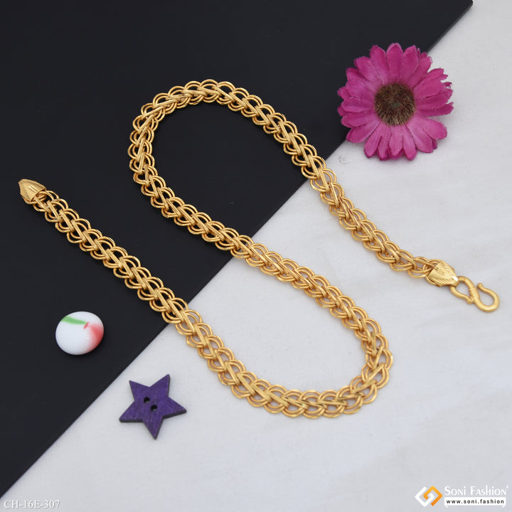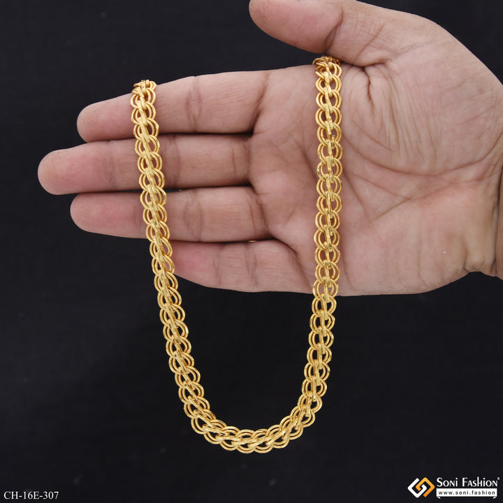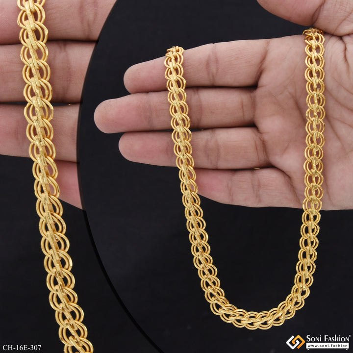 This 21-inch gold-plated link chain features a shining filigree design crafted from durable brass. Its intricate ring-into-ring pattern adds a stylish touch, perfect for men seeking a sophisticated accessory that stands out.