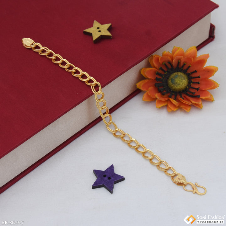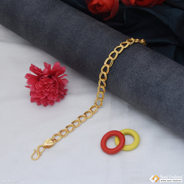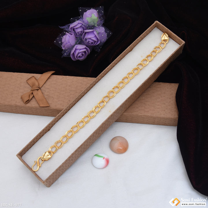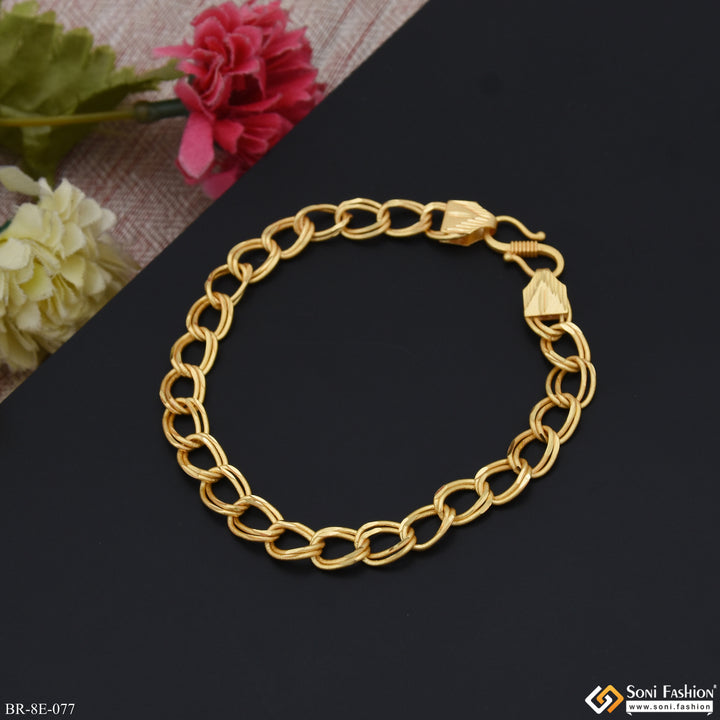 Ring Into Ring Trending Design Gold Plated Link Bracelet for Men. Featuring an eye-catching ring-into-ring design, this piece combines contemporary style with timeless appeal. The lustrous golden finish catches light beautifully, adding sophistication to any look. Durable brass construction ensures lasting wear, while the regular bracelet fit accommodates most wrist sizes comfortably.