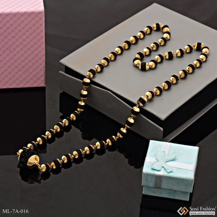 Elevate your spiritual style with this handmade Rudraksha mala, featuring a single bead design. Crafted from durable brass and beautifully gold plated, this black mala combines tradition and elegance. Perfect for men seeking a meaningful accessory, it supports meditation and religious practices while adding a refined touch to everyday wear.