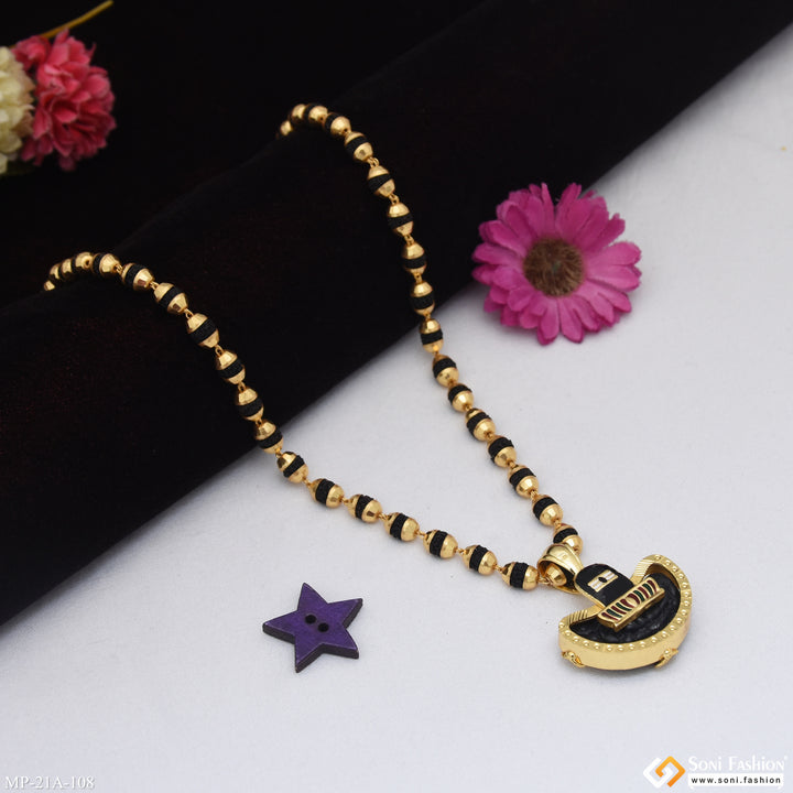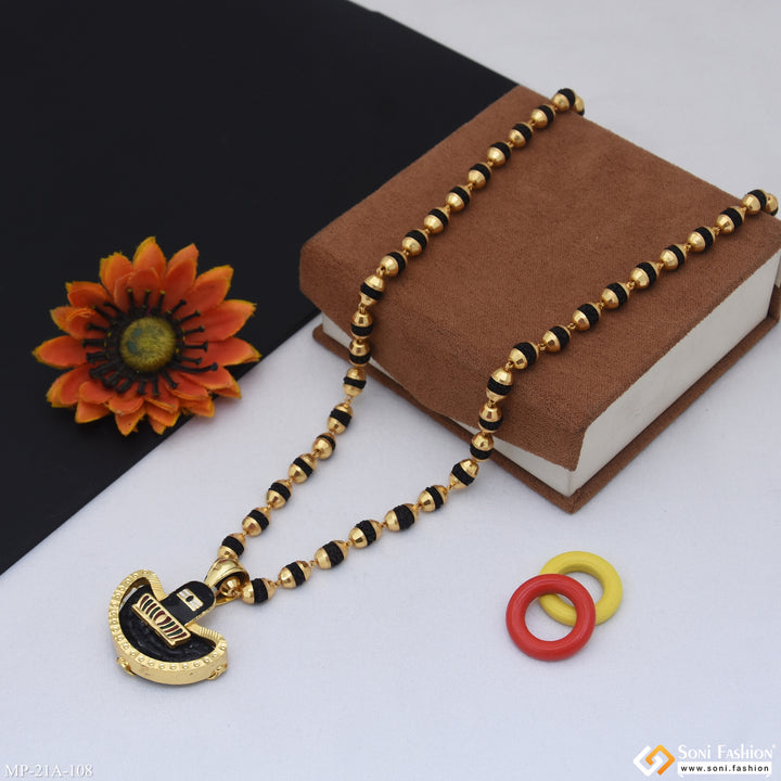 This Shivling pendant features a gold-plated brass design with intricate filigree work, paired with a traditional Rudraksha mala. Perfect for men seeking a religious accessory, this black mala pendant combines spiritual significance with elegant craftsmanship. Its shining finish and durable plating make it a meaningful piece for everyday wear or special occasions.