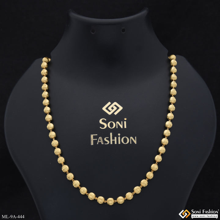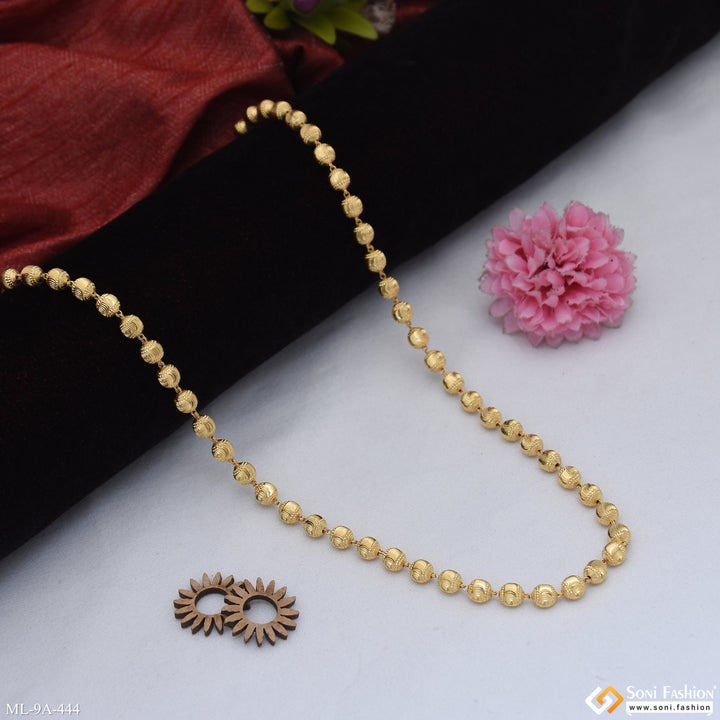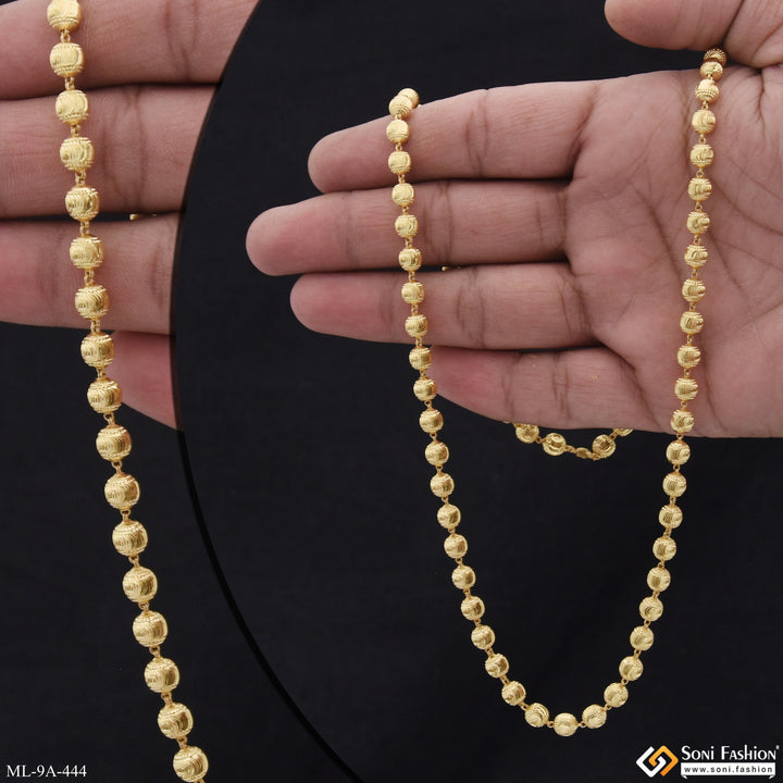 This trending gold-plated brass mala for men features a round bead design with intricate filigree work, adding a touch of elegance. Its high-quality plating ensures a lasting shine, making it a stylish accessory suitable for various occasions. Durable and lightweight, it combines traditional craftsmanship with modern appeal.
