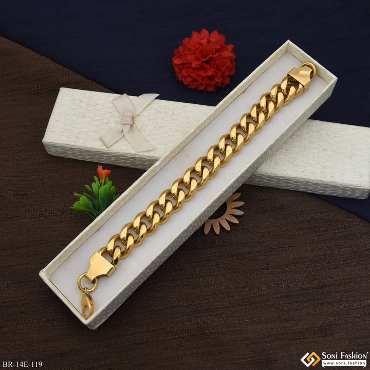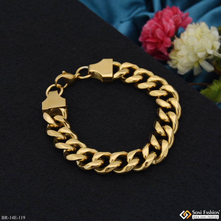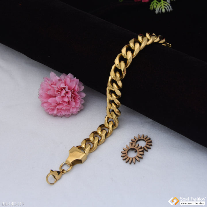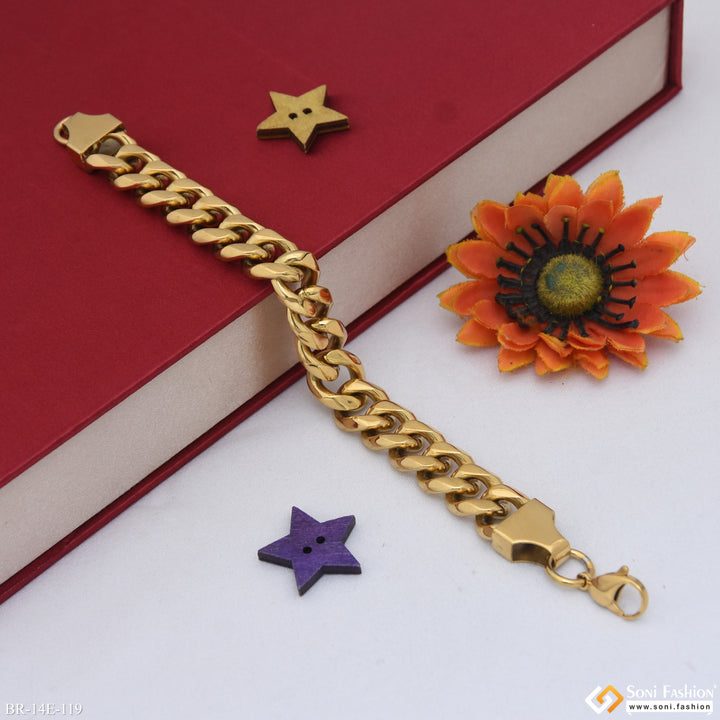 Elevate your style with this striking stainless steel Cuban link bracelet, crafted for the modern man who appreciates bold fashion. Featuring a lustrous golden plating that catches the light beautifully, this hip-hop inspired piece combines durability with contemporary edge. Perfect for layering or wearing solo, this regular-fit bracelet makes a confident statement whether you're dressing up or keeping it casual.