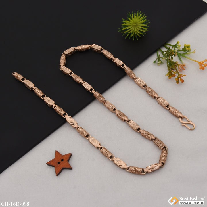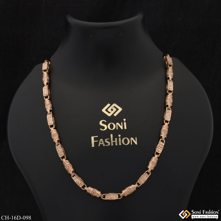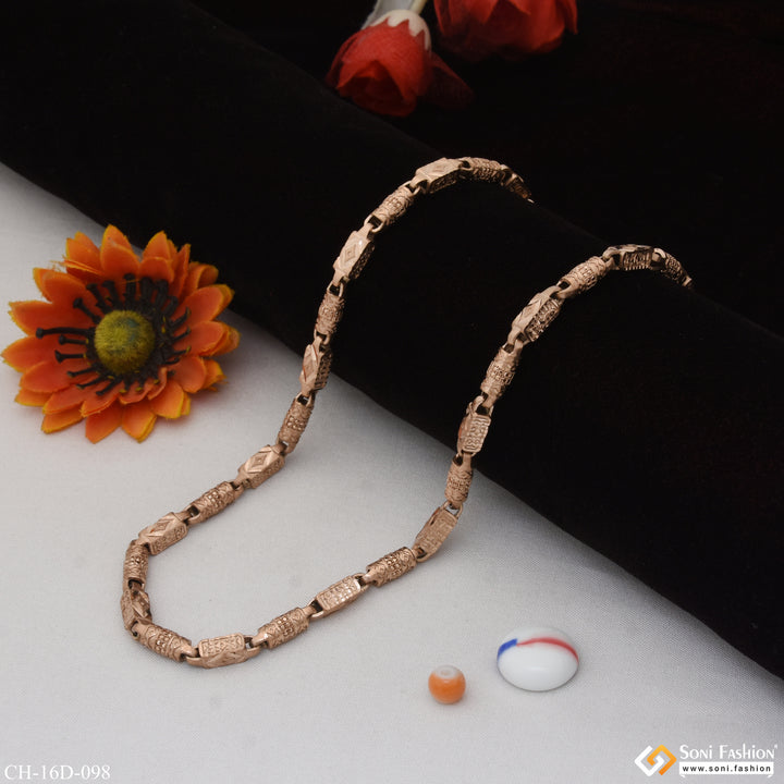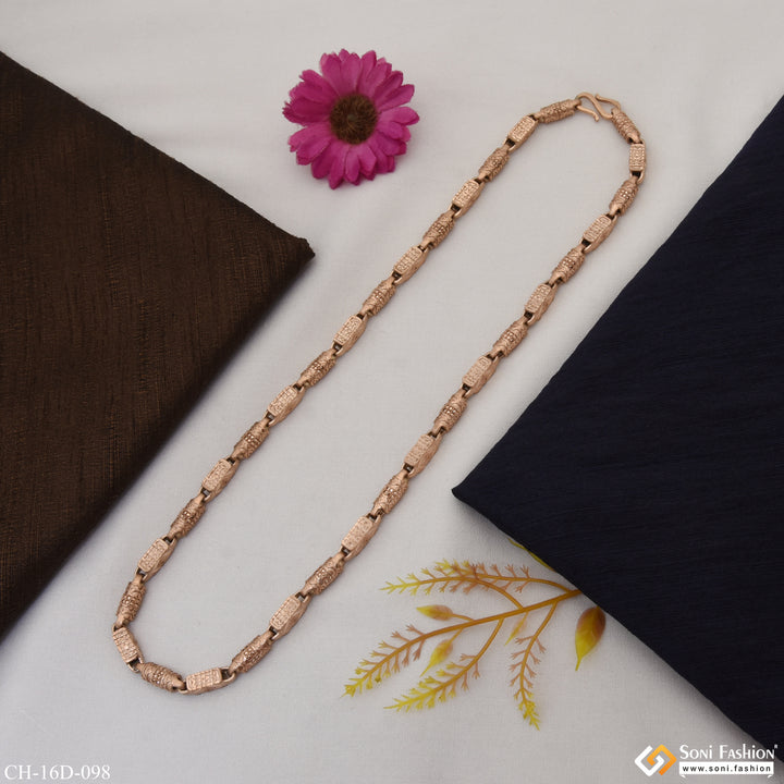This royal rose gold chain is the latest hip hop accessory for men. Its textured design and shiny finish add a touch of trendiness to any outfit. Made with hid_reg_plating brass...