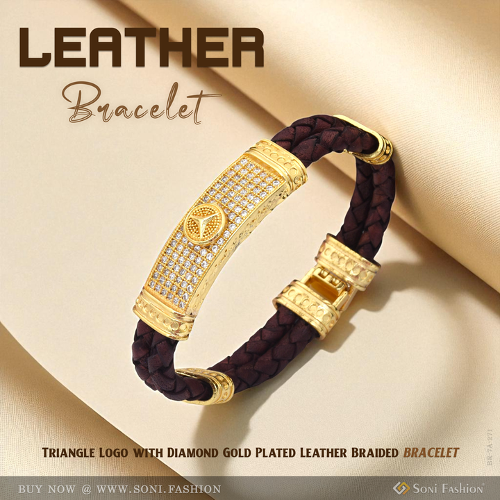 Triangle Logo with Diamond Gold Plated Leather Braided Bracelet for Men - Style A271