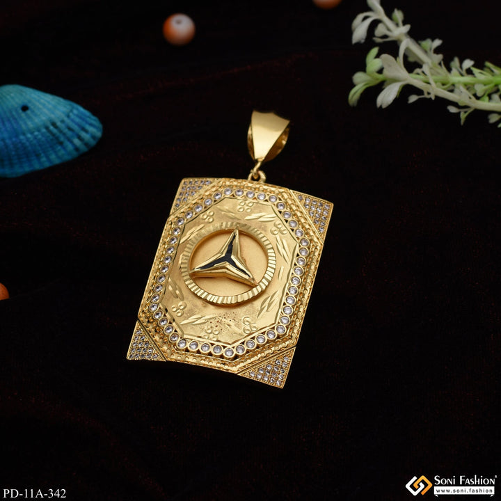 This Triangle Logo Diamonds Pendant, crafted with Superior Quality Brass and Gold Plated, features a textured, shining, and royal style. It is shaped like a rectangle pendant with diamond detailing, perfect for a special occasion or gift. The Hid_Reg_Plating process and golden color ensure lasting quality.