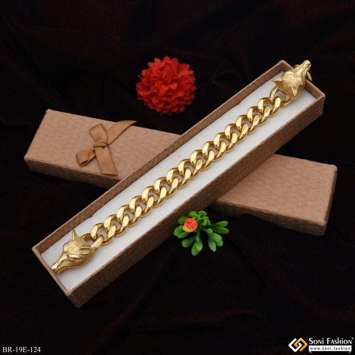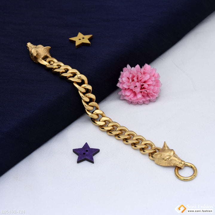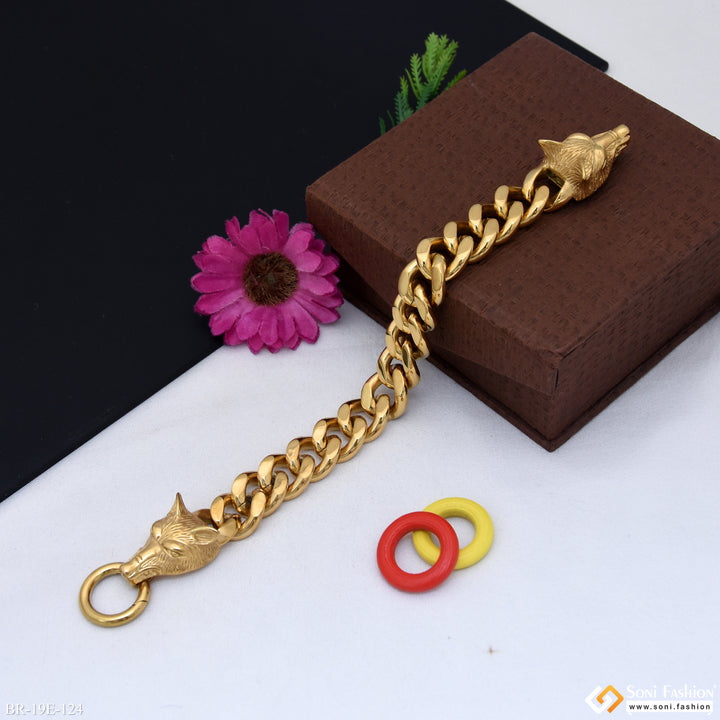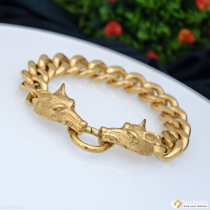 Wolf Face Excellent Design Stainless Steel Bracelet for Men Make a bold statement with this striking wolf face bracelet, crafted from premium stainless steel for lasting durability. Featuring a gleaming golden plating finish, this hip hop-inspired piece showcases intricate wolf detailing that commands attention. The lustrous shine catches light beautifully, while the robust construction ensures it withstands daily wear.