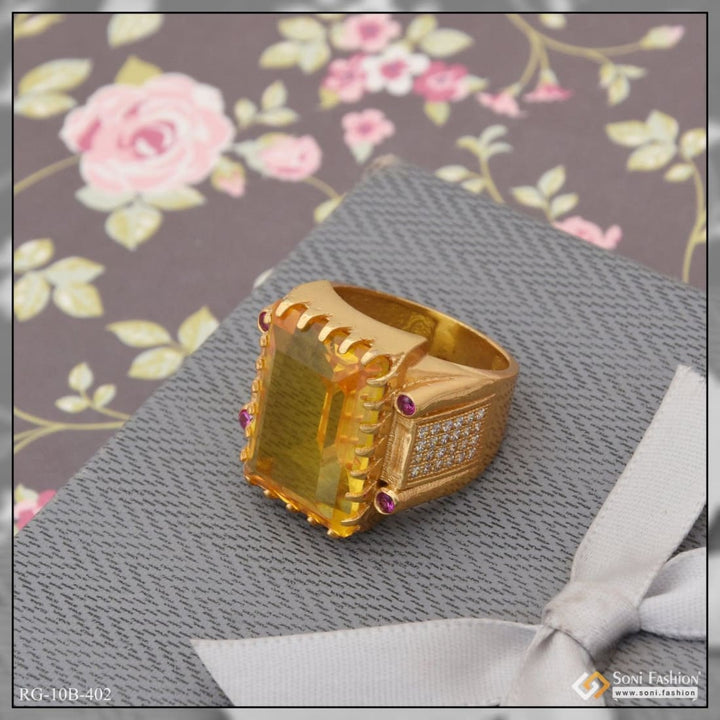 This yellow stone gold-plated ring for men is a fashionable design perfect for any occasion. Made of shining brass with a diamond in the center, the rectangular rajwadi hip-hop style is...