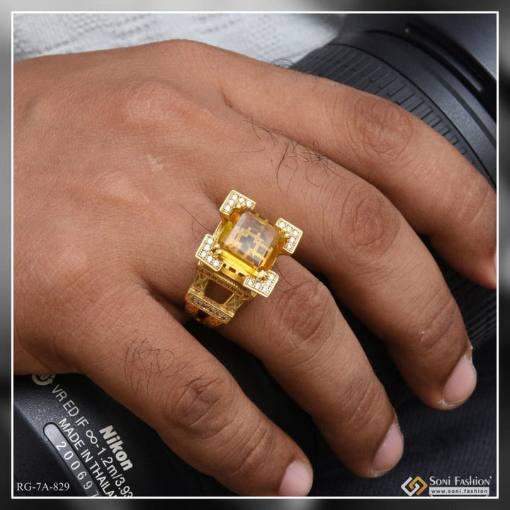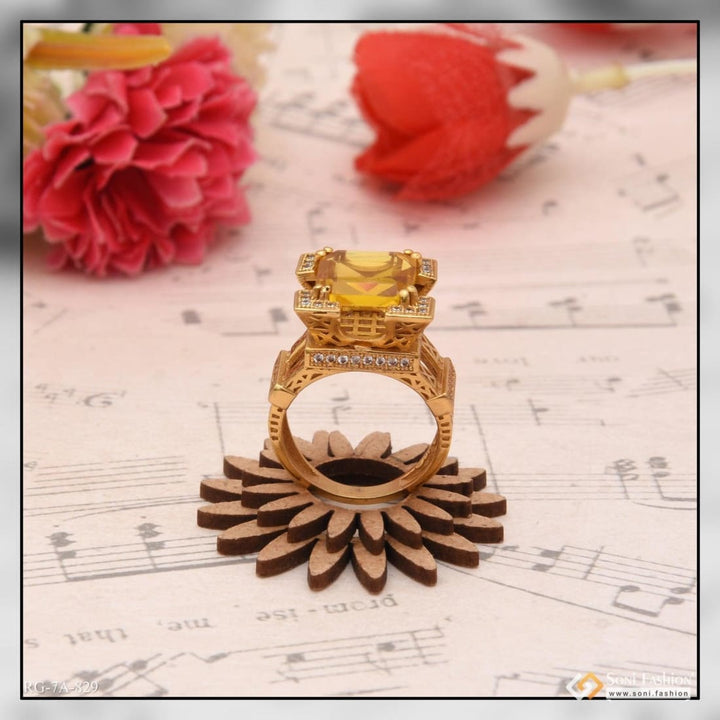 Introducing a classic and timeless design of a Yellow Stone Eiffel Tower Delicate Design Gold Plated Ring. Featuring a yellow ring accentuated with a textured stone and shining royal plating, this is the perfect choice for any groom. Crafted in brass and diamond for an antique look is an ideal accessory for any man.